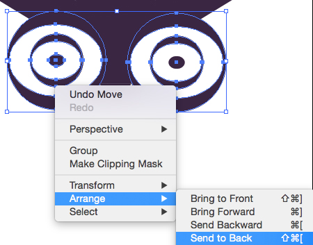 Vytvorené oči zväčšite a presuňte podľa obrázku. Potom ich umiestnite na poslednú vrstvu. Príkazom Arrange.