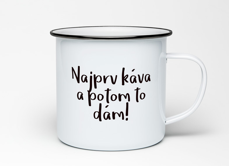 Výber sloganu je po grafickom návrhu druhá najnáročnejšia časť. Je dobré, aby slogan ladil s obrázkom. Slogan by mal byť vtipný a zaujímavý. My sme si zvolili slogan Najprv káva a potom to dám! Na tvorbu sloganu sme použili písmo zo stránky dafont.com, konkretne Om Telolet regular.